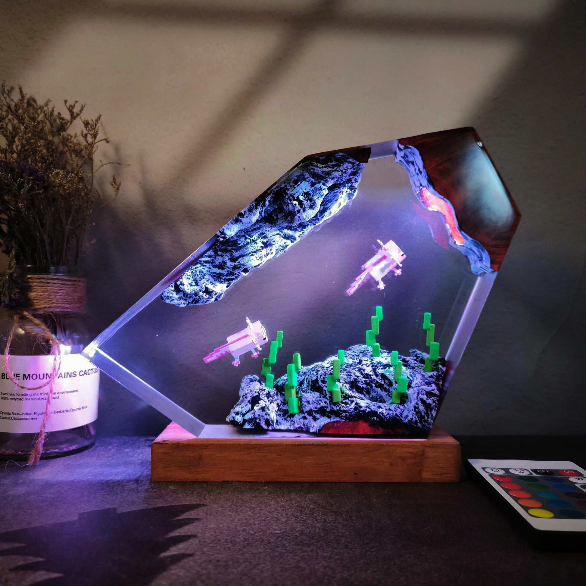 Dive into the pixel-perfect underwater world with the Axolotl Pixel Art Aquarium Night Light. This handmade epoxy resin lamp features adorable pixel-style axolotls swimming among vibrant green aquatic plants inside a crystal-cut resin block with a natural wooden base. The built-in LED casts a soft glow that transforms your space into a calming aquatic haven — perfect for bedrooms, gaming setups, or as a unique desk centerpiece.