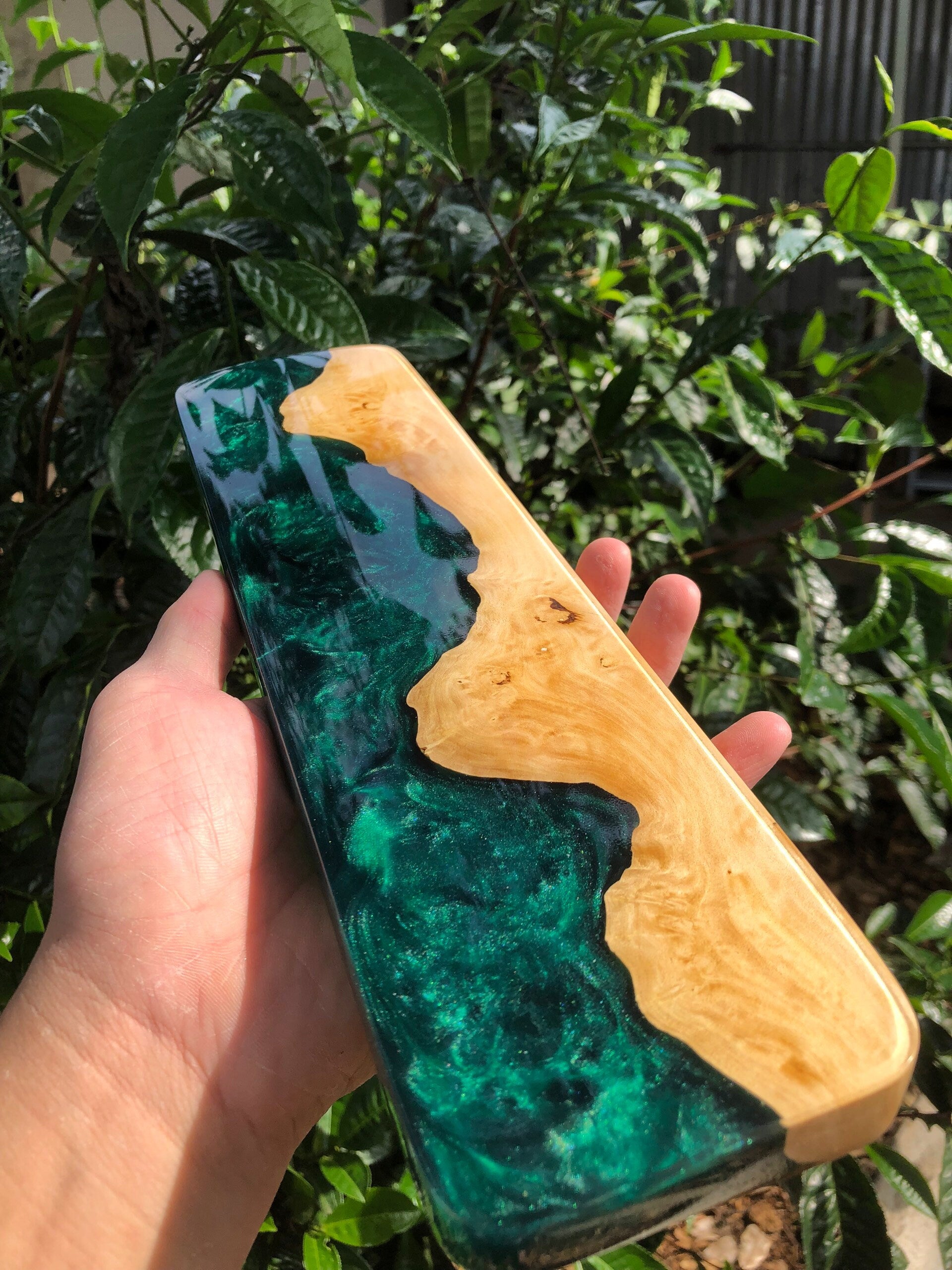 • Elegant emerald green resin with beautiful natural wood grain