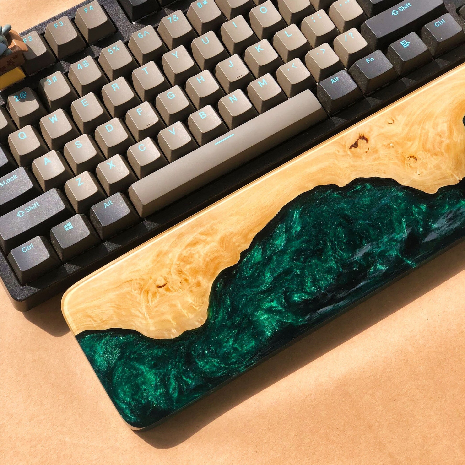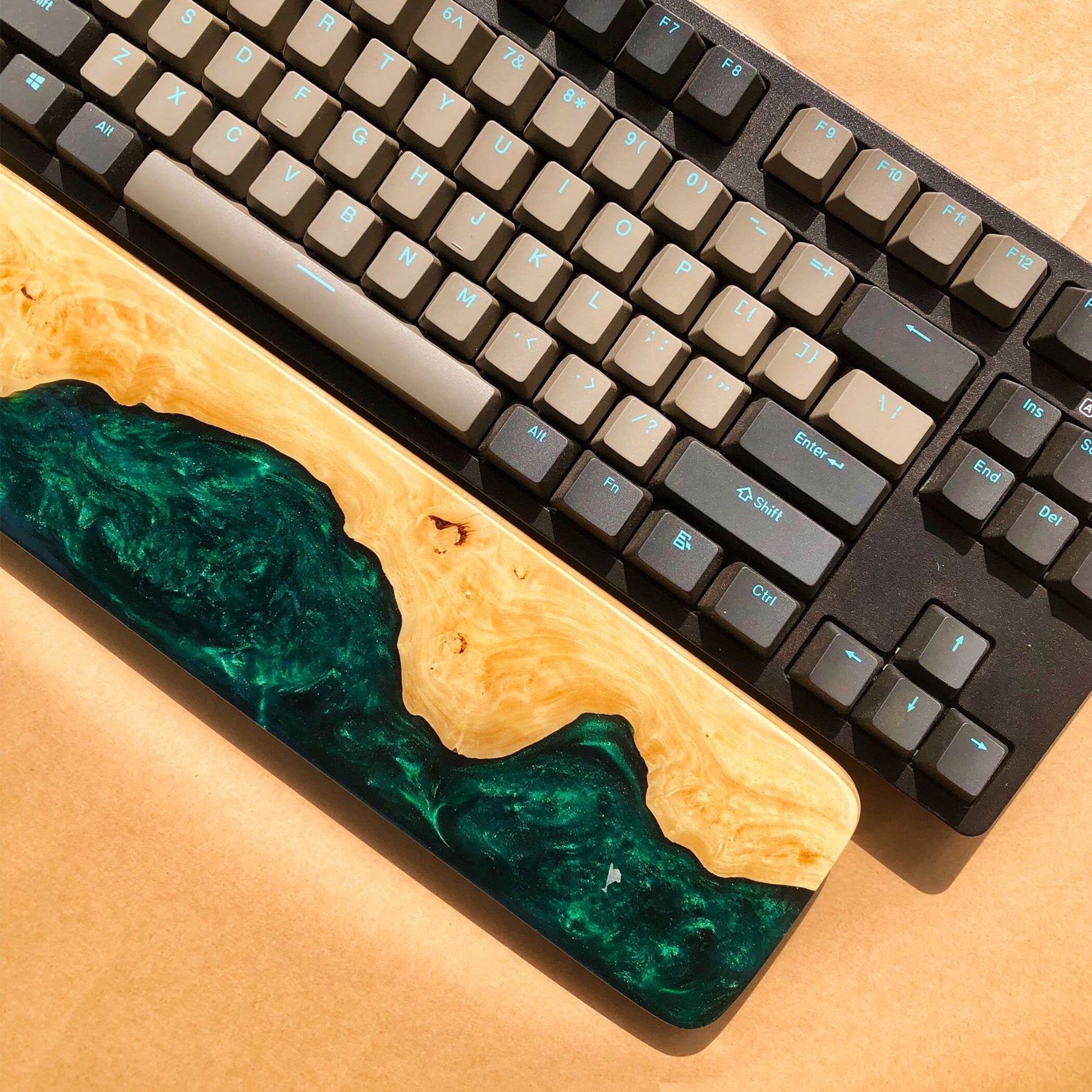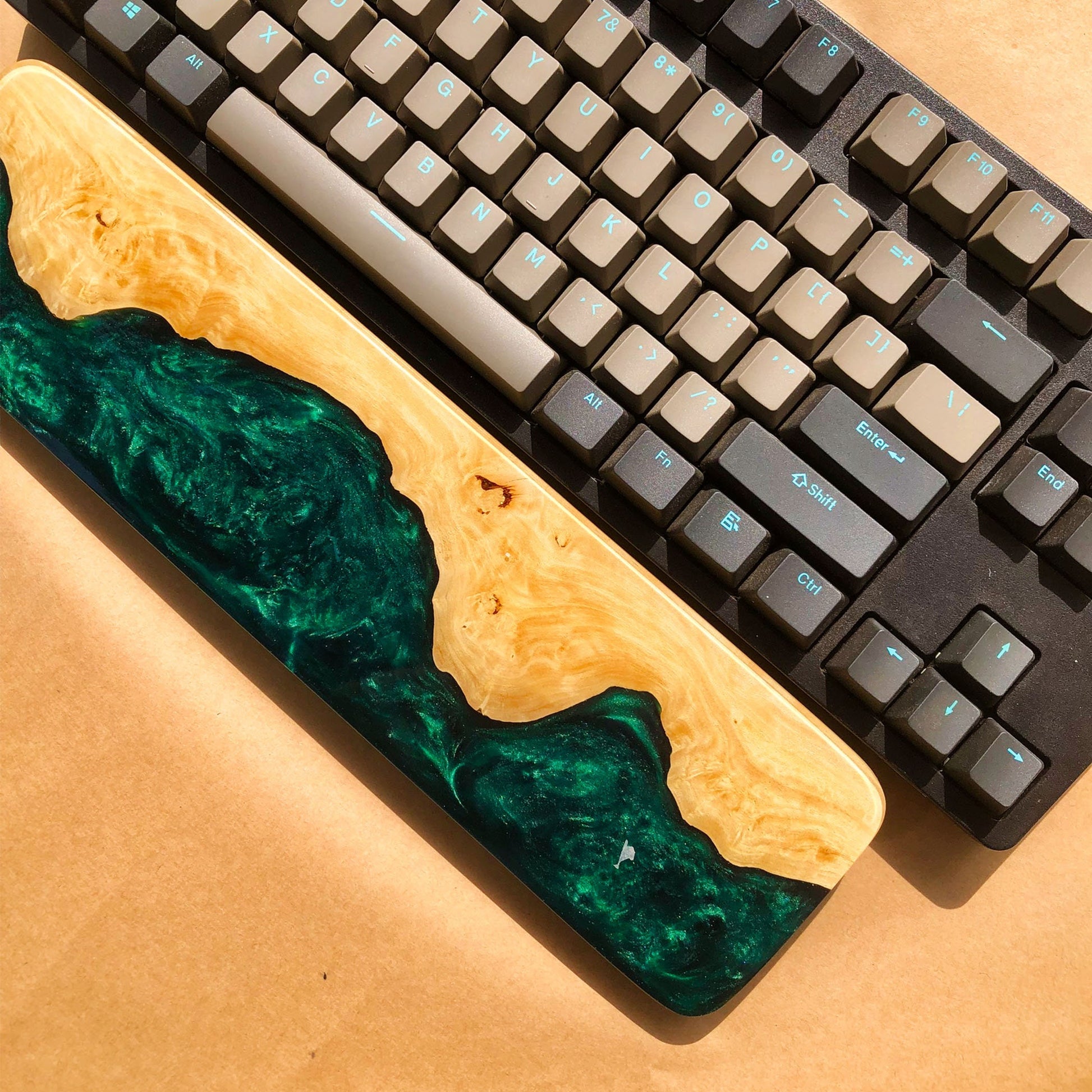 Handcrafted Wooden & Emerald Green Epoxy Wrist Rest – Natural Burl Wood Design